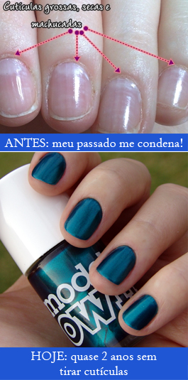 O hábito brasileiro, infelizmente, é esse. “Quanto mais se tira a cutícula, mais bonita ficarão as unhas”...só que ninguém avisa que quanto mais se tira a cutícula, mais a danada cresce! E como cresce! Sou prova viva disso. Façam as contas: tirava as cutículas desde os 13 anos…uma vez por semana, no mínimo (sim, às vezes eu tirava mais de uma vez) e não tava nem ai em tirar tudo e mais um pouco, pelo contrário – adorava! Tirava muito, mas muito mesmooo! Resultado? Cutículas grossas, feias, gigantescas. Meu racíocínio? “Eita, já cresceram? Lá vou eu de novo cortar vocês…” e mal eu sabia que só estava acelerando o processo de crescimento das coitadas.